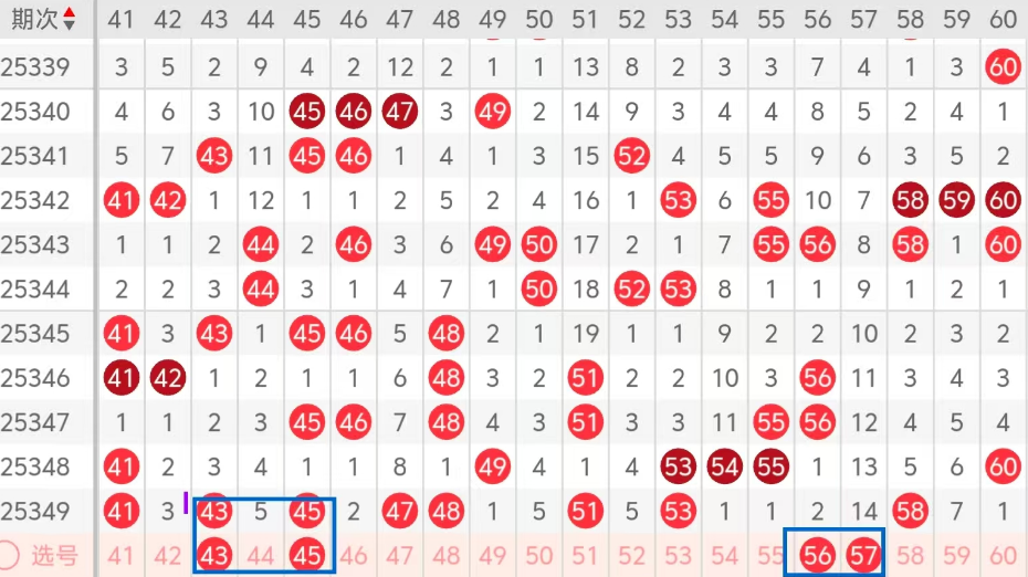 第三区间的走势分析:第三区间上期开出了八个号码球,主要的落号点位在三区间的前半区,走出了六奇两偶的形态走势,上期三区间的前半区落下了五个号码球,后半区落下了三个号码球,整个三区间处于走热的趋势,根据三区间的走势规律,今天的三区间我们主看前半区重码43 45的落位,也是热码的组合,再烂后半区56 57姊妹对号码的落位,也走出了边码的回补,落下一码的机会很大,这四个号码球建议大家打个四胆拖,或者打个四码复三比较稳妥,参考为主!
