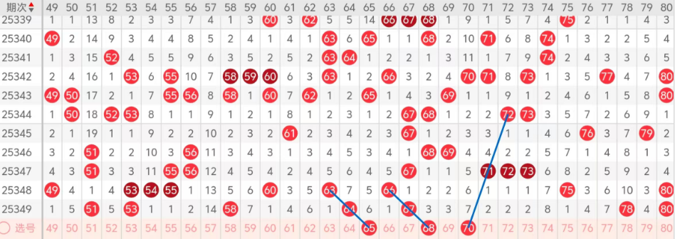 第四区间的走势分析:第四区间上期开出了四个号码球,主要的落号点位在四区间的前后半区,走出了一奇三偶的形态走势,上期四区间的前半区落下了两个号码球,后半区落下了两个号码球,整个四区间处于走冷的趋势,根据四区间的走势规律,今天的四区间我们主看前半区凤尾处65 68 70这三个号码球的落位,65 68都走出了斜连的走势。70走出了隔2期的斜连走势,重点关注70这个号码球的落位,这三个号码球建议大家打个三胆拖,或者打个三码复二比较稳妥,参考为主!
