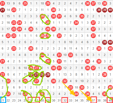 40: 40近几期较热,多次与邻号39,41直连,斜连出现,上期开出39.41,左右夹击,本期推荐40中心落下来。