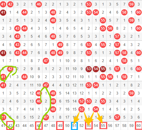 46: 46在15期内仅开出三次,其中有一次两连重号,偶数邻号48连续飘红三期,上期左斜连下来开出47,本期推荐,继续左斜连下来,推荐46.