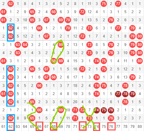 首先我们看下上期数据,和值为726。 奇偶比例为:12:8。 出了两组双连号,分别是05+06,10+11。 直连重号出了2个,分别是71和76,均为两连重号。未出现断层区域。我们把 01-40划分为前区,41-80划分为后区,则小号偏多。未开出冷号,均为热号和温热号。