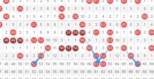 上图是福彩快乐8开奖号码走势图一部分,我在上面走势图中标志出来的数字52 61 62 67都是斜连号码,数字52一直从数字54斜连,数字61一直从数字63斜连,数字62一直从数字59斜连,数字67一直从数字65斜连,那么这几个斜连号码,你们觉得可以出几个呢?通常快乐8喜欢出斜连号码。