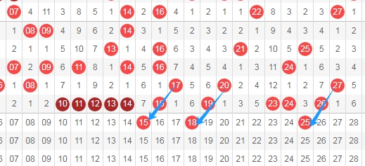 上图是福彩快乐8开奖号码走势图一部分,我在上面走势图中标志出来的数字15 18 25都是斜连号码,数字15一直从数字17斜连,数字18一直从数字20斜连,数字25一直从数字27斜连,那么这几个斜连号码,你们觉得可以出几个呢?通常快乐8喜欢出斜连号码。