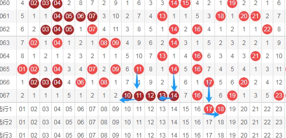 上图是福彩快乐8开奖号码走势图一部分,我在上面走势图中标志出来的数字17 18连号,你们看上面走势图中标志出来的蓝色小箭头,上面数字11隔一期后就出现了连号数字1011,数字14隔一期后就出现了连号数字1314,那么本期数字17隔一期会不会出现连号数字1718呢?这个是根据走势图最近开出的特点去选择号码。