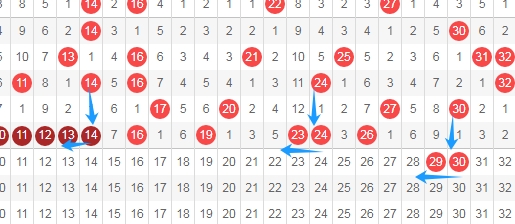 上图是福彩快乐8开奖号码走势图一部分,我在上面走势图中标志出来的数字29 30连号,你们看上面走势图中标志出来的蓝色小箭头,上面数字14隔一期后就出现了连号数字1314,数字24隔一期后就出现了连号数字2324,那么本期数字30隔一期会不会出现连号数字2930呢?这个是根据走势图最近开出的特点去选择号码。