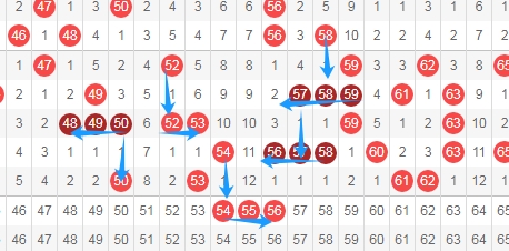 上图是福彩快乐8开奖号码走势图一部分,我在上面走势图中标志出来的数字连号54 55 56,你们在看图中标志出来的蓝色小箭头都是隔一期就有连号的走势,这个是最近号码的特点,那么本期54 55 56可能是54 55 56一起出现,也可能是54 55或者55 56。