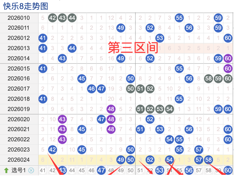 三区间开出了6个奖号(49.50.52.54.57.58)上期回顾三区开出6个奖号上期的三区间的奖号数量呈现一个递增的形态,4头回补1号码,本期先来看号码43近期出现频率相对来说还是很稳定。偶尔有时间隔期数也是很长,说明其在近期的开奖中较热的,号码47在近 30 期内出现次数相对较不是稳定的号码,近期的活跃度也是较温热。号码53有一定的间歇性,通常间隔5-3期会出现一次,没有明显的连续出现态势,走势相对较稳定,在整个第三区间的表现本期还是可以防守的。号码60走势相对近期较热,近期有连续间隔落号的情况,活跃度近期处于较热状态注意防守。