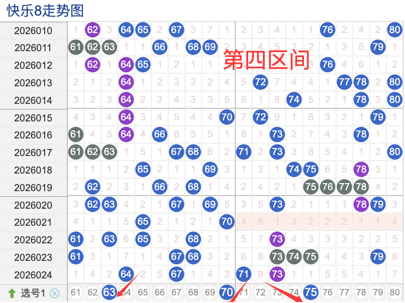 上期四区间开出了4个奖号(64.67.71.73)上期的四区开4个奖号呈现了一个递减的趋势,开出的奖号7头回补2个,6头回补2个,先来看号码63在近 30 期内属于还是很稳定的号码,近期出现频率相对也是稳定的,偶尔会间隔多期后出现一次,这个号码要注意防守,号码70具有一定的间歇性活跃度较稳定比如有时会间隔 3到5期就再次出现,也有时会间隔多期,近期整体出现频率比较温热,近期还是要关注的.号码75活跃度近期比较温热,有一定的间歇性。活跃度近期较一般,整体走势有一定的波动性.