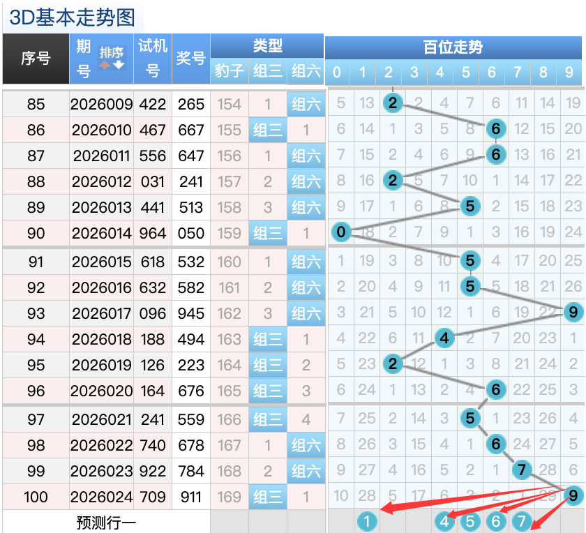 上期3D十位开出的奖号是1号,上期在十位上1号球这个号码在上期是一个小码回补的落位点,本期来看6号和7号球在十位上要注意这两个号码是有机会继续顺着上期的1号球继续走出两个常搭配落位趋势这里的两码是大号码注意防守一码就好了,5号球还是个常搭配码的落位点,然后0号球还是一个冷码回补的落位形态也是一个顺位落位形态回补落位点,再来看9号球是小周期码回补这个点位是一个错位码的落位形态。