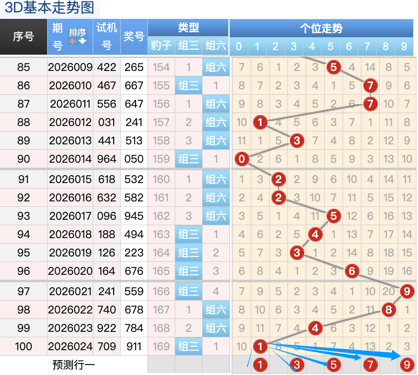 上期的3D个位开1号球,上期开出的是组三按照形态的话本期打组六形态,上期的1号球的落位是个位上的一个3跨的小号落位趋势,本期先来看3号球在个位还是有机会继续走出小号的落位点这里要注意,1号球和5号球是这里的落位点是两个小周期号码的落位点这里注意防守一码就好了也是这里的两码走势都是非常好看的注意选择一码,再看9号球这里注意继续走小号拉拽大号的落位形态。