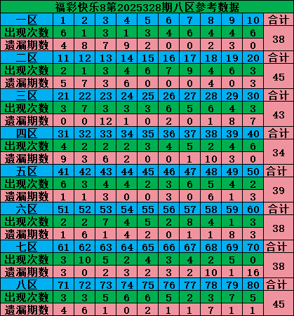最后再把号码分为四区:一区01-20号、二区21-40号、三区41-60号、四区61-80号,理论上每个区每期应该开出5个号码: