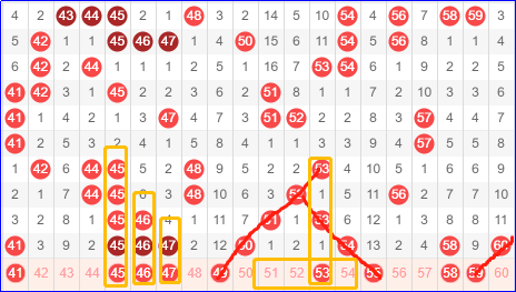 第三区间号码41-60,三区直接倍增号码,可惜方向出了错误,但我相信直播间还是会有人从这个区间获利的!尤其是随着45-46-47的开出,定然有人中了不小的奖金。像二区和三区这样的区间,一般在开出八个号码或者以上时,对于号码的增减基本都会是一个小幅度的范围,不像四区,直接跳水。所以下一期这里应该还有一定的机会。