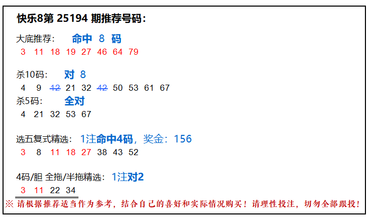 结合上期的数据分析,对快乐8第25195期的推荐如下: