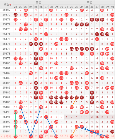 四区开出:36,37,40 奇偶比: 1:2 和值:113 跨度:4,上期开出3个号码,偶数号码占优势。本期无三斜连走势,隔码斜连走势:38 39。近5期出号量:3-0-1-2-3,近10期平均出号2.6枚,上期奇偶比: 1:1。本期推荐关注号码:32、38、39。