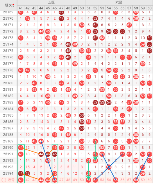 五区开出:41,42,46 奇偶比: 1:2 和值:129 跨度:5,上期开出3个号码,偶数号码占优势。本期无三斜连走势,隔码斜连走势:46。近5期出号量:4-4-1-0-3,近10期平均出号2.3枚,上期奇偶比:-,本期推荐关注号码:41、44、45、46。