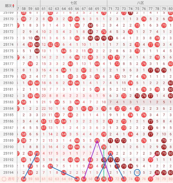 八区开出:78,79,80 奇偶比: 1:2 和值:237 跨度:2,上期开出3个号码,偶数号码占优势。本期无三斜连走势,隔码斜连走势:71 73。近5期出号量:1-4-3-3-3,近10期平均出号2.8枚,上期奇偶比: 1:2,推荐关注号码:71、73、75、77。