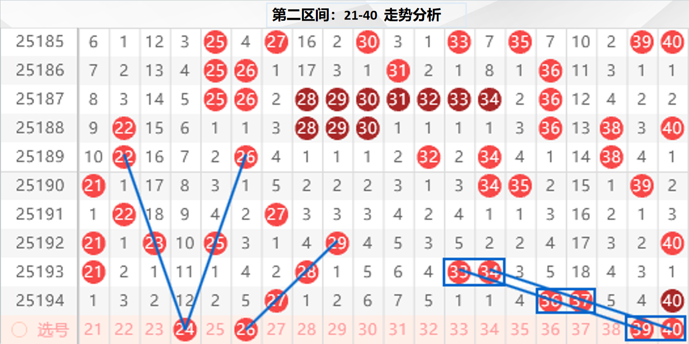 二区分析:【21-40】(走势图标注号码非小黄车大底,请谨慎参考,具体思路将在直播间分享讨论)