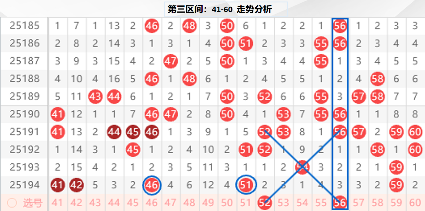 三区分析:【41-60】(走势图标注号码非小黄车大底,请谨慎参考,具体思路将在直播间分享讨论)
