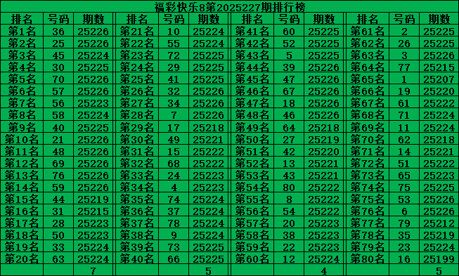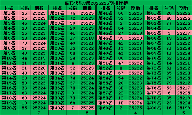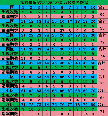 最后再把号码分为五区:一区01-16号、二区17-32号、三区33-48号、四区49-64号、五区65-80号,理论上每个区每期应该开出4个号码,2025226期五区比例:3:4:6:3:4