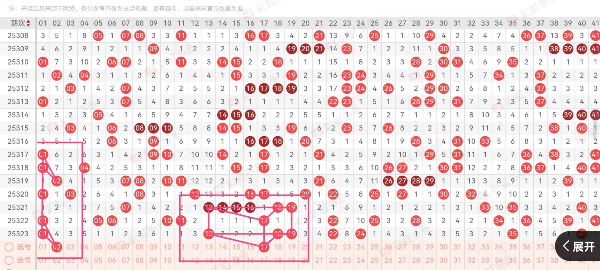 注:如本期开出号码含01那么我就会提取关于01开出后近100期内历史数据前10名的跟随开出的号码,我会删减掉本期杀号后保留剩余的跟随号码,因数据分析太多耗时太久且为了缩减选号范围,我就只提取近100期前10名的跟随号码。