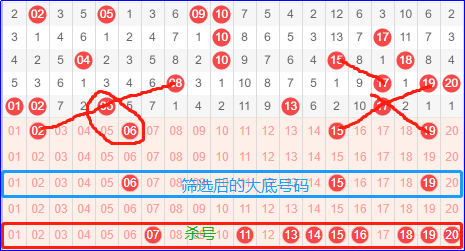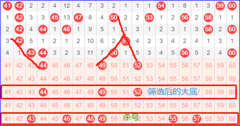 第三区间号码41-60,三区放在上一期的话应该是不错的选择,奈何43姗姗来迟。但也算是41-50这个地方出现回暖的迹象了。下一期要注意的地方就是43-50之间的区域了。