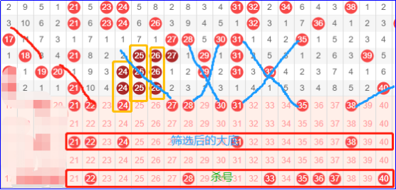 第二区间号码21-40,二区与一次走出了连号的重号,这样的号码估计没几个人敢买,这也是屡屡出其不意的地方。等到下一期大家都想买的时候了,我估计下一期二区前半段应该是要适可而止的了,但是从冷热上判断,没有理由放弃这样的地方不做二转做其他地方。所以防守号码依然要做出来。剩下就是中间这里了,尤其涉及到蓝色交叉的四个号码,取药特别注意一下。
