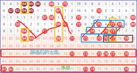 第四区间号码61-80,等了那么久,四区后半段终于开始发力了,预料不错的话,下一期这里依然会是重点区域,昨天这里判定出号,不过作号有点错位。下一期如果做的话,可以参照一下蓝色走势和黑色走势标注。