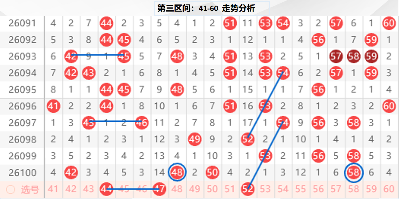三区分析:【41-60】(走势图标注号码非小黄车大底,请谨慎参考,具体思路将在直播间分享讨论)