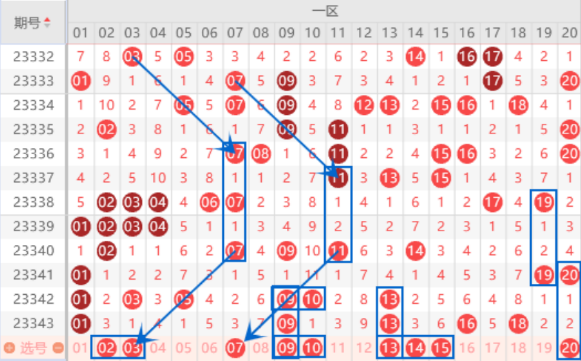 该区间的02 03号数字我们要注意一下出一个号码的情况,本期的01号数字应该是出不了4重号了,所以应该会出在02 03这里吧。本期的07号数字我们也是可以注意一下,出号机会还是有的。本期的我们注意一下09 13号数字出一个三重的情况,重点关注一下09号数字的出号情况。本期的10 11 12号数字我们也是要注意出一个号码的情况,重点关注一下10 12号数字的出号情况。本期的14 15可以关注一下出一个号码的情况。本期的阶梯连号19 20和连号21 22应该是要回补号码了,我们重点关注一下19 20号数字的落号情况。