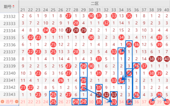 上期开出了23 25 27号数字,本期我们注意出一重一夹的情况,夹号可以关注一下24号数字的出号情况,重号可以关注一下25号数字的出号情况。本期的29号数字是属于空三中心号,本期的空三中心号有两个,我们防守一下出一个号码的情况。上期开出了两组3连号,分别为31 32 33和76 77 78,本期看好31 32 33出重,76 77 78号数字断号,所以本期这里我们是要做重号的。上期开出了39号数字。本期我们注意一下走分边的情况,也可以防守一下39号数字出重的情况,毕竟上期是27 39号数字同出的。
