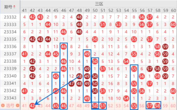 该区间的42号数字我们注意一下出号情况,42号数字是属于42 45 48三斜连号码,出号机会还是有的。本期我们关注一下连号45 46号数字落下一个号码的情况。本期的50号数字我们也是要注意的,49号数字空一回补了,那么本期50也是有可能回补的。本期的55号数字我们注意一下出号情况,也是属于重号空一对称号码。
