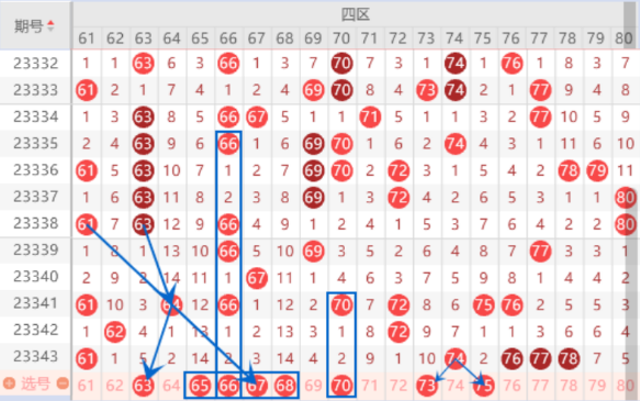 本期的63号数字我们注意一下,有可能本期会出现重号回补的情况。本期的65 68号数字我们要注意一下出一个号码的情况,这里可以防守一下三连号的出号情况。本期的70号数字我们注意一下,本期可以防守一下68 70 72号数字同出的情况。上期开出了74号数字,本期我们注意一下出现分边的情况,所以本期的73 75号数字我们也是要注意出一个号码的情况。