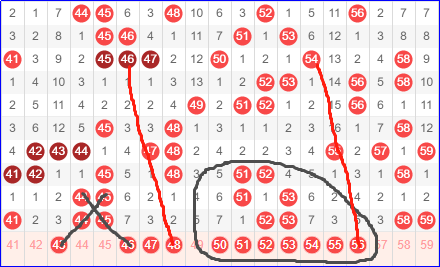 第三区间号码41-60,三区应该是本期重点需要去做的区域,在310期出现三个两连号之后,下一期出现连号的可能大大增加,尤其是在上一期连号附近可以重点关注。