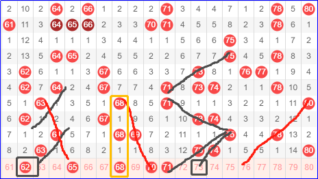 第四区间号码61-80,四区虽然不见得会是本期的一个重点区域,但是不妨碍它里面出现好的号码,尤其是我们标注的走势号码,对于本区来说应该是一个完美的走势。