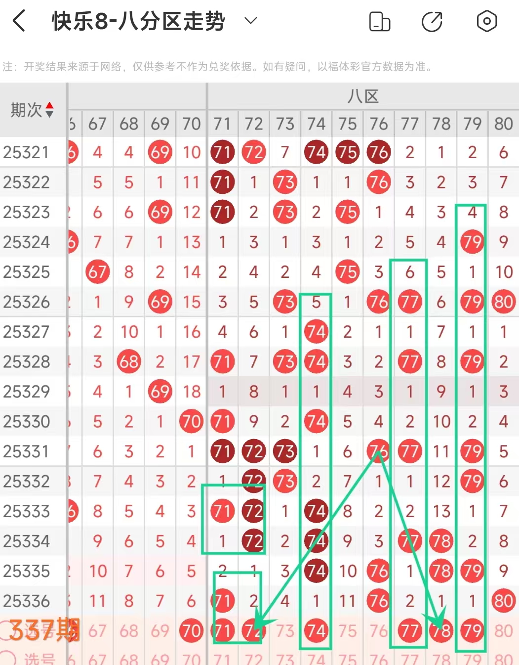 上期八区开出71 76 80这3个号码, 本期可以考虑2个左右