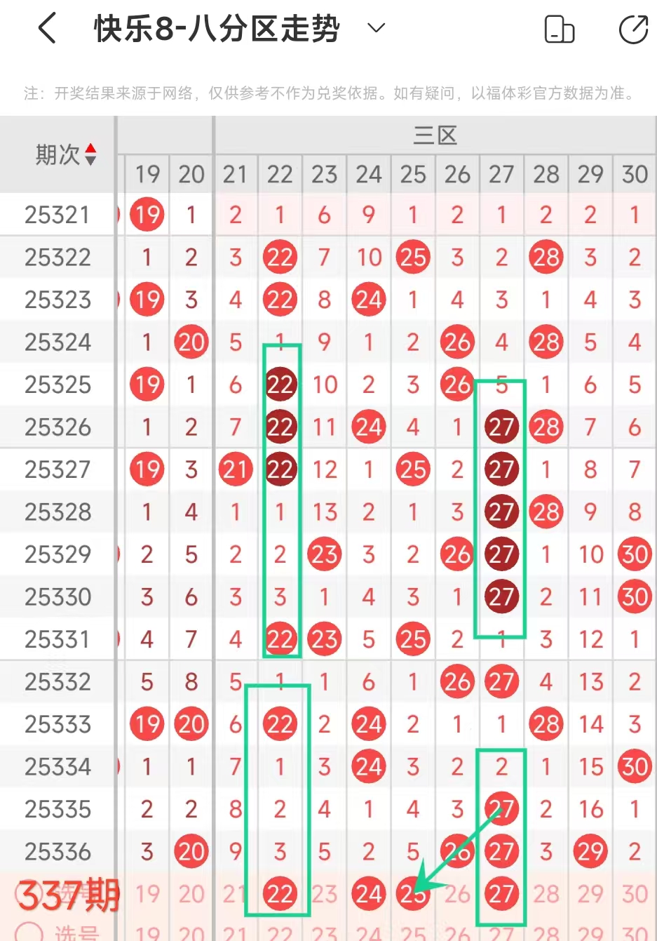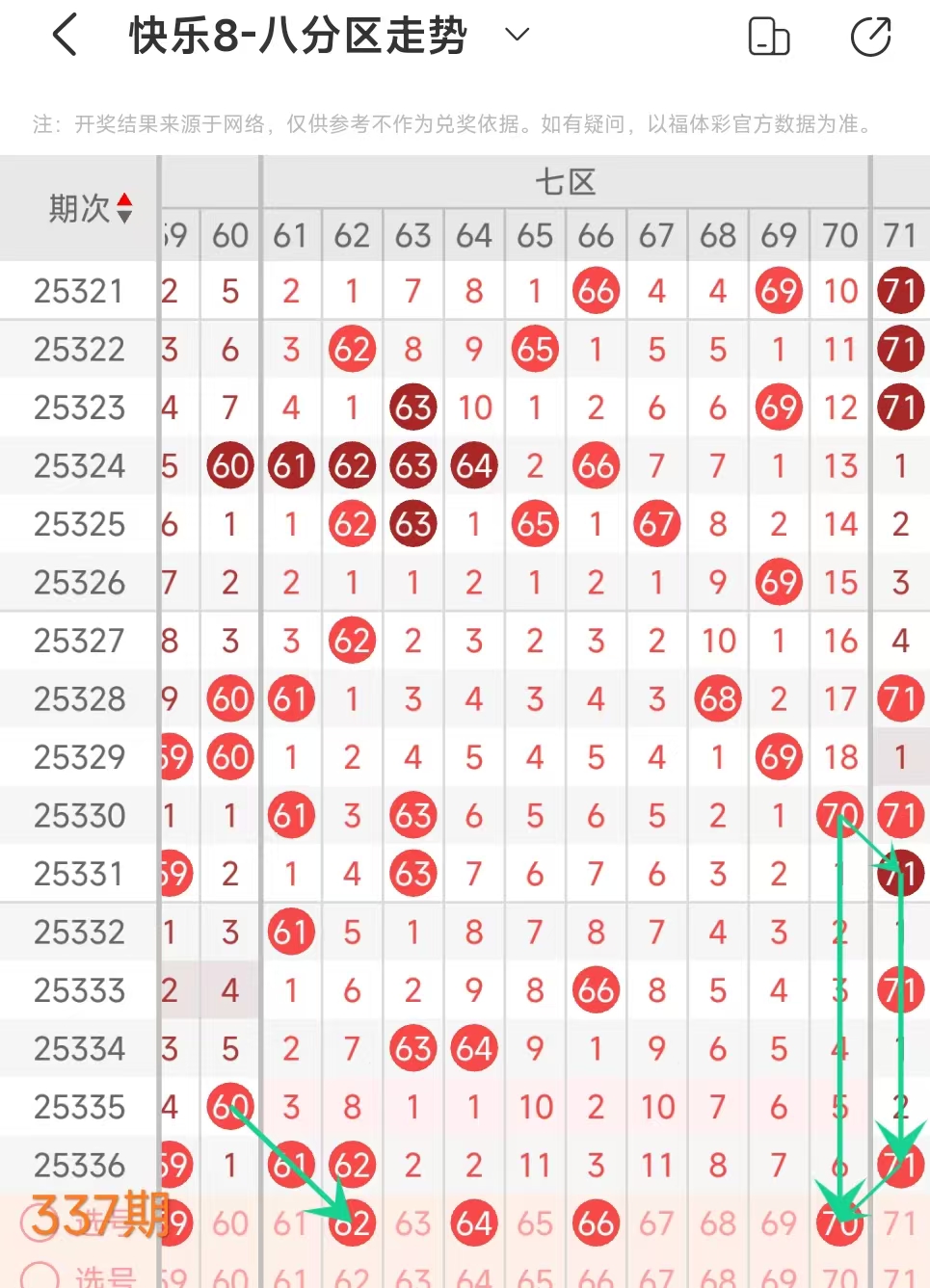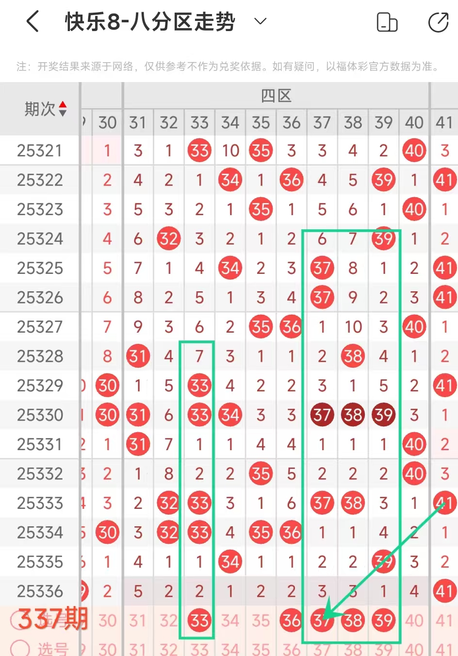 在快乐8的探索之旅中,通过对开奖走势图细致入微的观察,我们总结出一些具有参考价值的规律。几乎每一期开奖号码都呈现出以下显著特征:其一,大概率出现连号;其二,常常伴有边码;其三,遗漏值为1 2 3的号码频繁现身;其四,重号现象也较为常见。掌握这些要点,能为我们的投注提供方向指引。我们约定采用八分区走势图来展开分析。