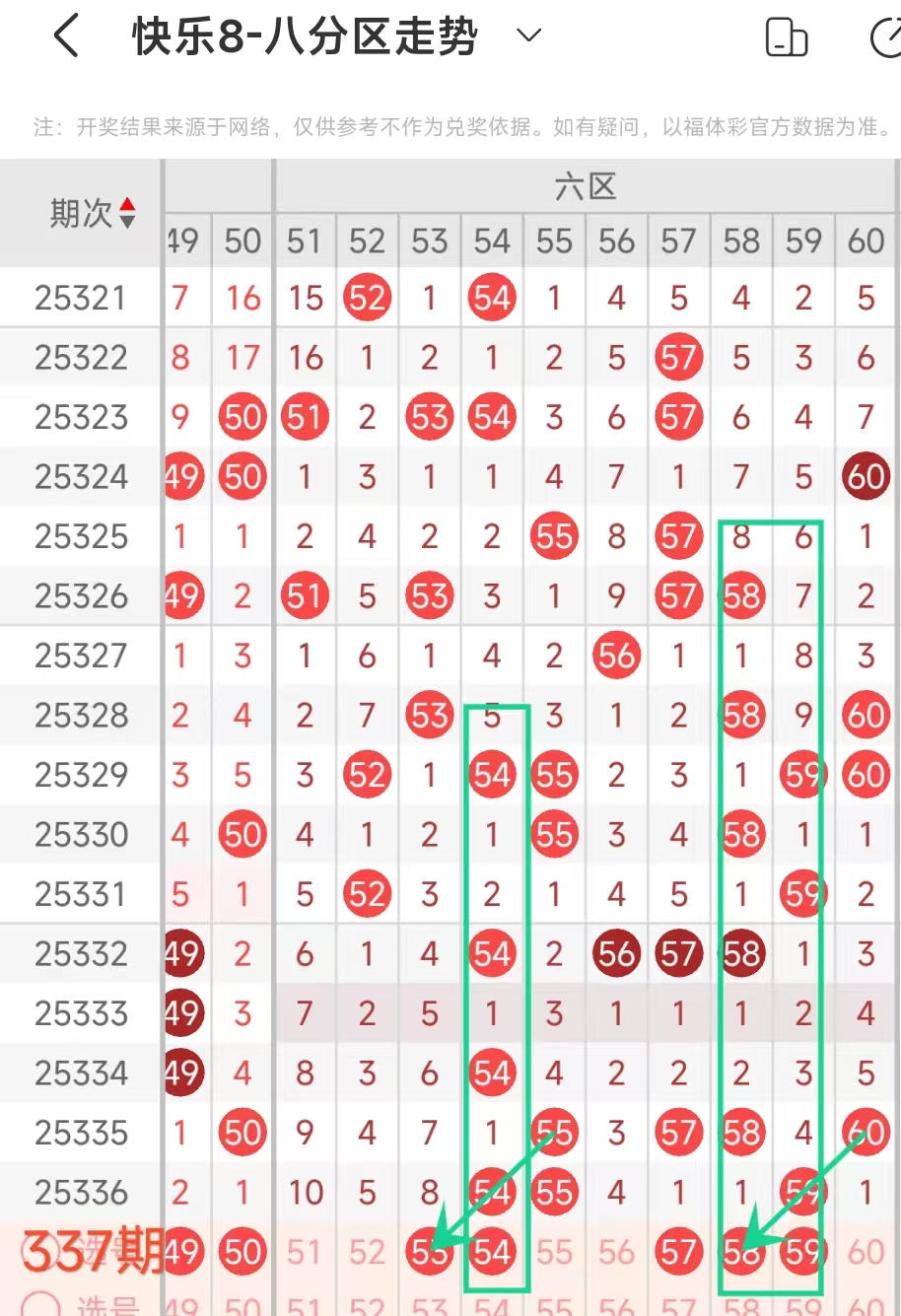 上期六区开出54 55 59这3个号码,本期应该出2个。