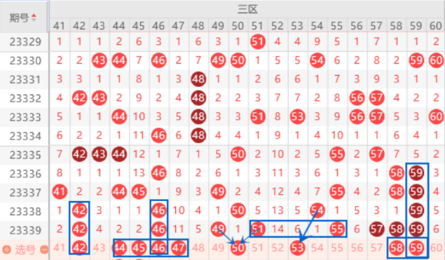 本期的42 46号数字我们要注意出一个三重号码的情况,而且也要注意一下43 44 45出现堵门的情况,这里应该会出一个号码,我们重点关注一下44 45号数字的出号情况。本期的47 48号数字我们要注意出一个号码的情况,重点关注一下47号数字的出号情况。本期的44 53号数字都是属于空三中心号,本期我们注意一下出一个号码的情况。上期开出了三连号57 58 59号数字,本期我们注意一下57 58 59号数字开出重号的情况,有可能本期的57 58 59号数字都是重号的,可以防守一下。