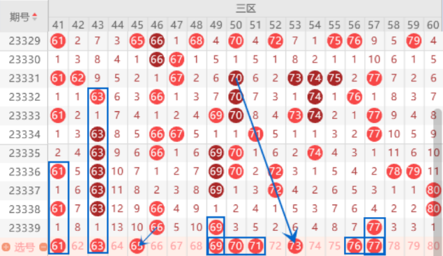 本期的61号数字我们可以做一下防守,属于空一对称类型出号机会还是有点的。本期的63号数字也是同样如此,可以关注一下。本期的62 65 68号数字关注一下,已经遗漏8期没有出号了,本期应该是要出号了,我们注意一下。本期的69号数字我们要注意出重号的情况,这里可以防守一下69 70 71号数字同出的情况。上期开出了77号数字,本期我们要注意一下走重和分边的情况,重点考虑一下76 77号数字同出的情况。