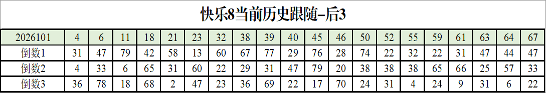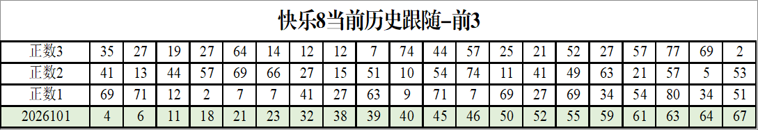 我感觉选热的同时,还要注意防冷条件开出,可以直接选取每个号码跟随出次前三的号码,也可以考虑把出次最后的三个数字加进去,不过这样可能号码太多,可以尝试。图上也能看出单独号码跟随的情况,我就不一一统计每个号码的出次了,我这里考虑提高概率,取每个号码历史跟随的前三号码和后三号码,根据2026101期的号码,我关注正数3和倒数3的号码号码为: