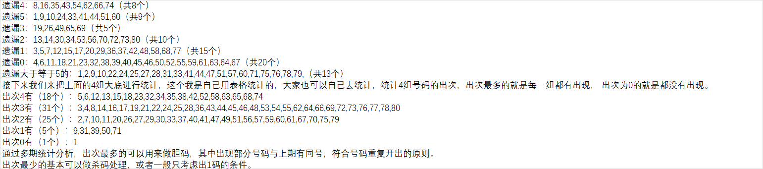 如果把对数和补数合起来有40个号码,中间可能还会产生一下重复数,通过近几期的统计分析,以上期数据进行补数对数计算推算下一期的概率不高。为提高概率,我主要是用前两期的数据来进行对数补数推算,然后再组成一个集合,作为我的第四组大底号码。