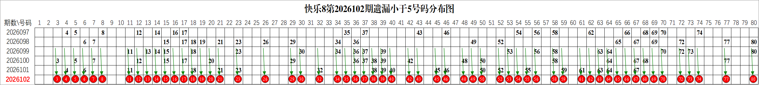 所以这个条件值得关注,从号码分布图上我们可以分析出,遗漏小于5期的号码有: