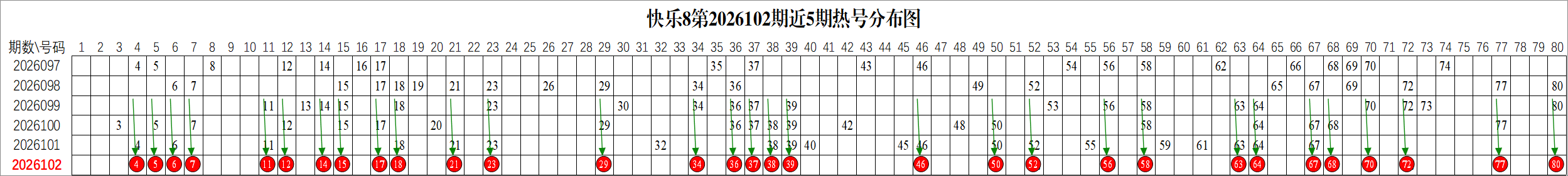尾数分析其实是简化号码的做法,把80个号码用10个尾数来分析,通过多期来看,尾数变化灵活多样,我的思路是把上期尾数出次进行统计,分析出次多少情况,一般情况下,最热的尾数,下一期基本不会持续热下去,上期最冷的尾数,下一期也不会持续冷下去,所以我选取上期尾数排序中间的6个尾数作为本期看好的尾数,那么6个尾数包含了60个号码,相比较也是大概率开出号码的条件。