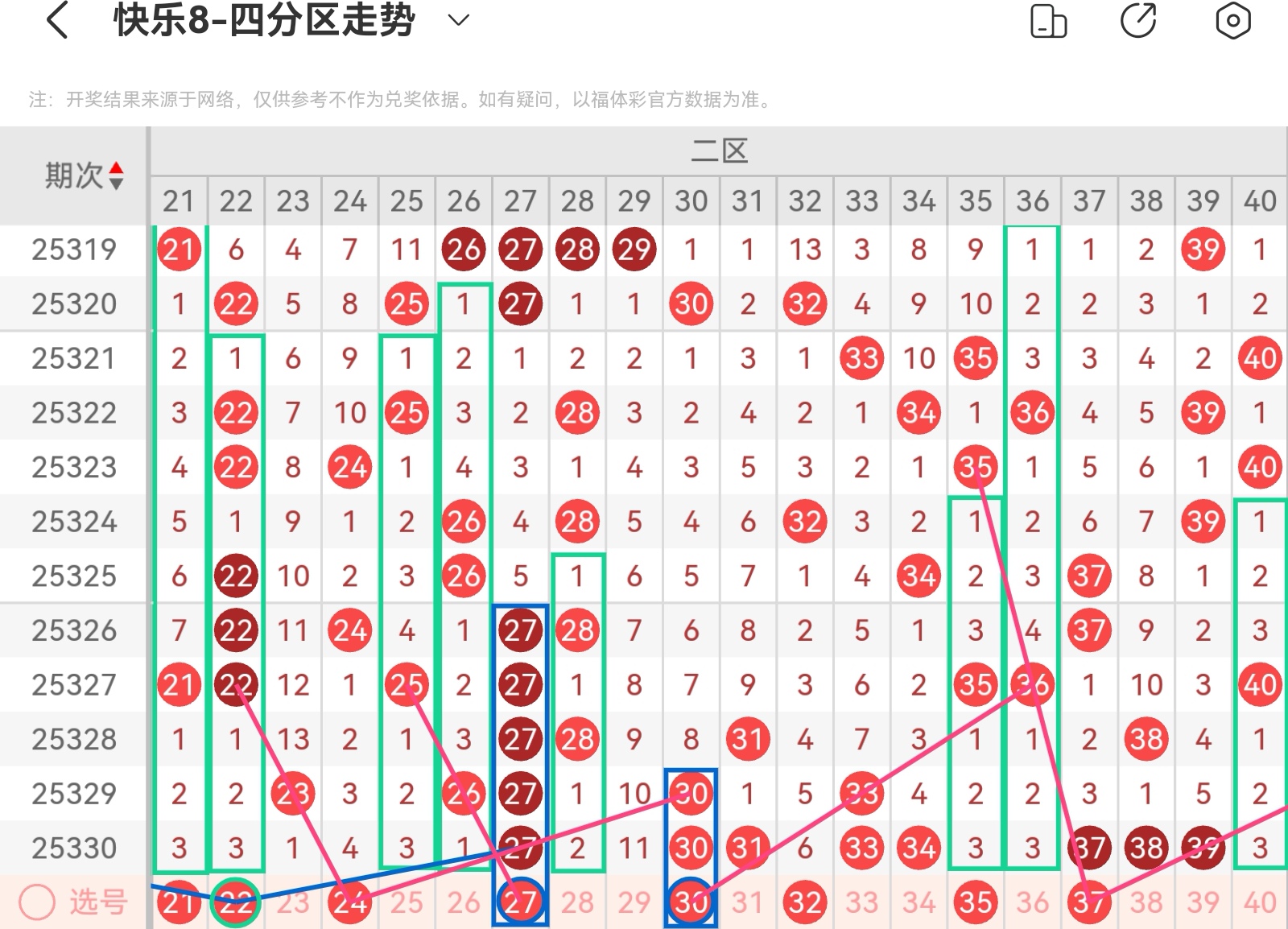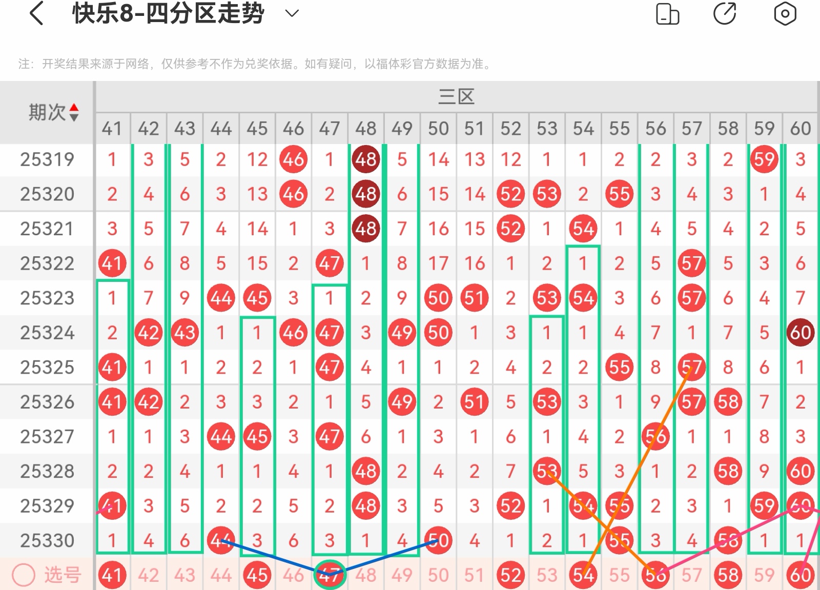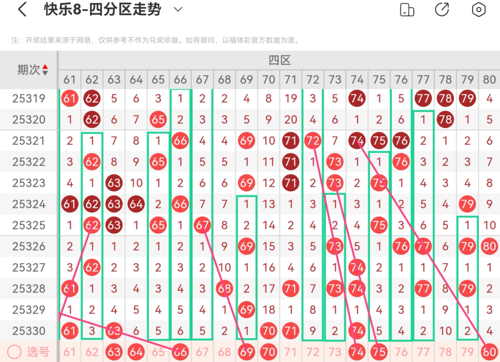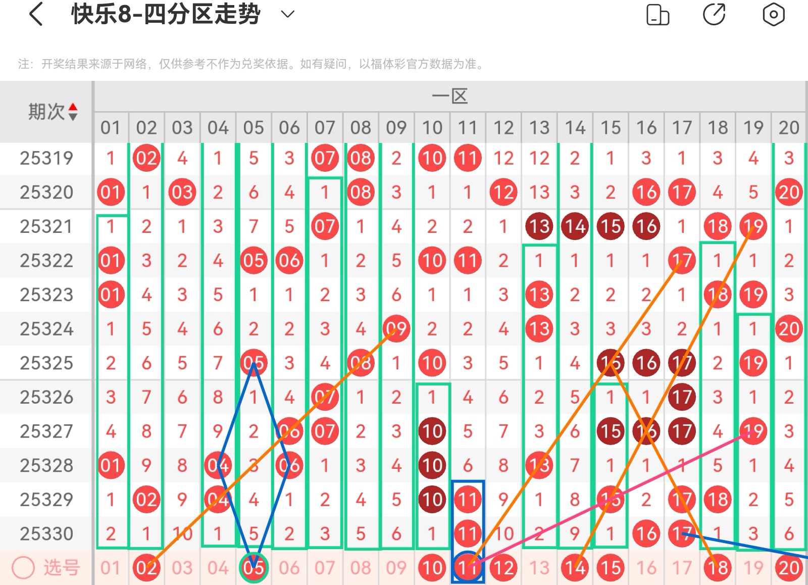 大家好,我是甜丝丝的坏事,主要以快乐八的形态走势、空位走势、遗漏走势以及斜连走势相结合的方法,用公认的四分区走势来进行预测分析,希望能让你有所收获。