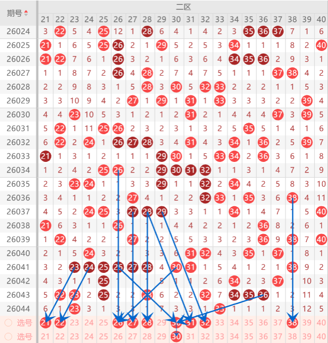 二区间注意打底号是21.22.26.27.28.30.35.36.38.中关注2-3码开出机会,