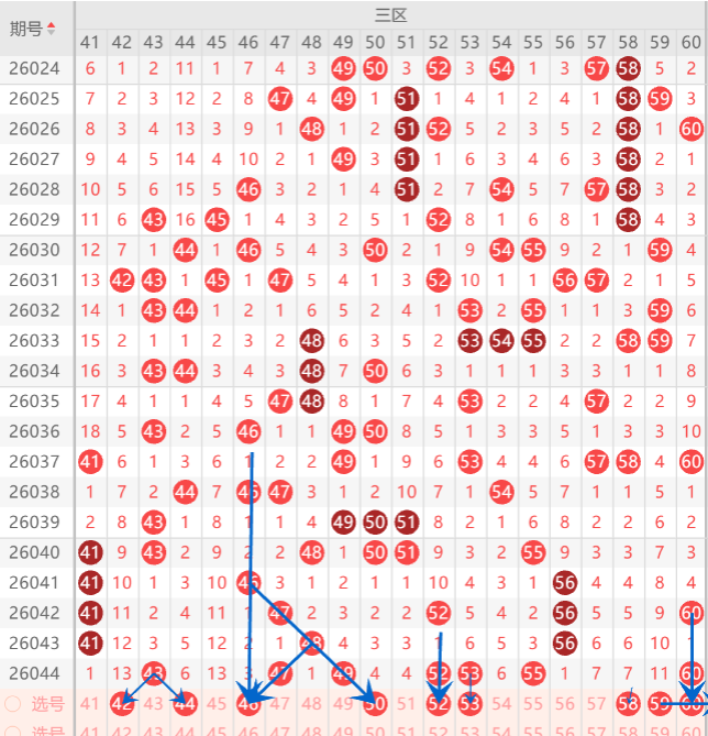 三区间在近期的走势上分析,上期三区间爆区开出了7码,而且整体区间还是一个温热形态,上期三区间开出的形态是隔期回补空位回补和重码分边走势,上期小妹在文章中布局到了4码开出,那么本期三区间我们要重点关注的形态是重码走势,孤码分边,空位回补,那么本期首先注意重码走势上的52.53.60.中选择一码走重机会,而孤码分边上的42.44.59.中参考一码分边机会,至于空位回补上防守45.46.58.中选择1码回补机会,上期重点关注在空位回补上开出了2码,那么本期重点关注在斜连号下拉位置上注意防守布局一码机会,如图所示。而三区的打底号是43.44.45.46.50.52.53.58.59.60中参考3-4码开出机会,