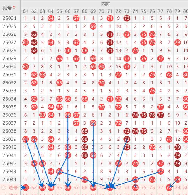四区间的打底号是61.62.65.66.67.68.69.70.71.74.75.78参考4-5码开出机会