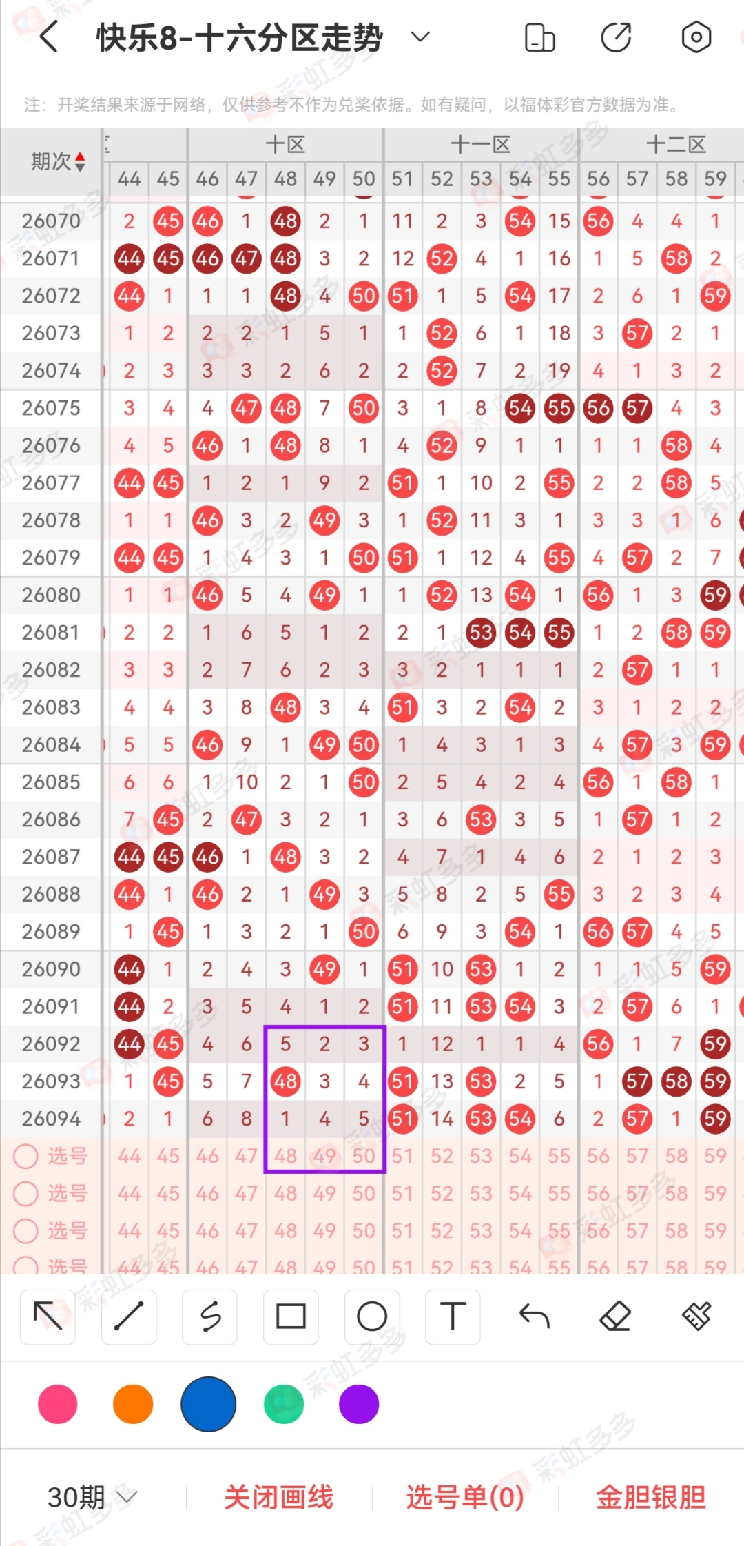 然后我们通过上面的几张图片整理一下近期的235期数据。首先多开1码,少量走重,间隔1期稳定出1码。这里的间隔1期不是指定的对称,可以顺位也可以走重。理想的话4期延伸继续出1码或者多码。对比昨天的35 36这里可以发现已经在4期数据存在号码,对比25 26可以发现,26是存在机会走重。所以按部就班,今天的48 49 50可以考虑1码,03 04 05 06可以大底1码。24 25 26可以大底1码,34 35 36可以防守1码。这样子就能够类比昨天的04或者整体参考,存在一定的整体区间判断。