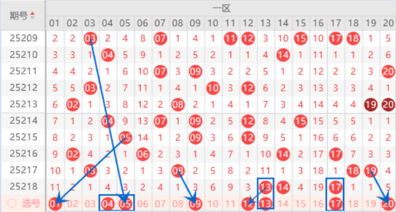 该区间的01号数字是属于三斜连号码,出号机会是有的,我们可以防守一下出号情况,本期可以防守一下01 04号数字同出的情况。本期的05号数字也是属于斜连号码,出号机会是有的,我们可以防守一下05 09号数字同出的情况。上期开出了13 14号数字,本期我们注意出一个重号的情况,其中的13号数字可以重点关注一下,本期的12号数字是属于213乱序号码,出号机会也是有的,我们可以防守一下12 13号数字同出的情况。