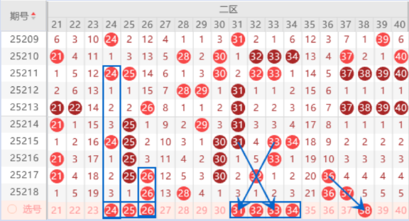 该区间的24号数字是属于空三对称号码,出号机会是有的,本期的25号数字是属于321走势,本期也是有机会出号的,本期我们可以防守一下24 25号数字同出的情况。本期的31 33号数字是属于交叉对称号码,本期是有机会出一个号码的,可以重点关注一下,本期的34号数字是属于连号斜连号码,出号机会也是有的,所以本期这里可以防守一下31 34号数字或者33 34号数字同出的情况。连号38 39 40号数字本期我们要注意落下一个号码的情况,其中的38号数字可以重点关注一下。